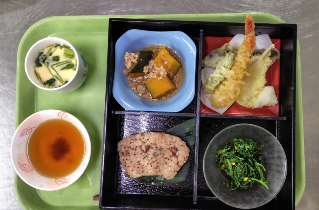 また昼食には天ぷら・茶碗蒸し・お赤飯を盛り込んだ祝御膳を、午後のおやつには紅白まんじゅうをご用意しました。「おいしい」と喜ばれる声を聞くことができ、ささやかではありますが心を込めたお祝いをお届けできたのではないかと感じております。