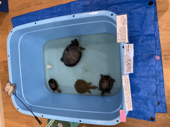「かえる」「ヘビ」「亀」。水槽の前で目をキラキラさせて興味深く生き物達を観察する子供達。大人は「ヘビ~」と恐怖の声が・・・