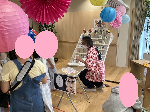 敷地内の駐車場では、やきとり・チョコバナナ・輪投げにドリンク。お昼に入居者様と屋台のご飯を一緒に食べ、阿波踊りを見て、戦隊ヒーローに挨拶して充実した1日を過ごすことができました。