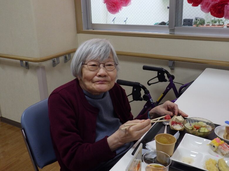 小さな船盛りや、見た目もかわいい押し寿司が並ぶと、入居者様からは、「これ何かしら、きれいね」「どれにしよう、迷っちゃう」「美味しい!満足です」「次も楽しみにしてるよ」と、嬉しい声があちらこちらから聞こえてきました。